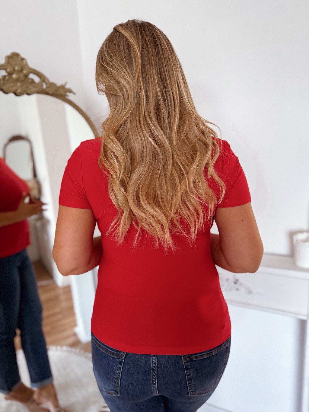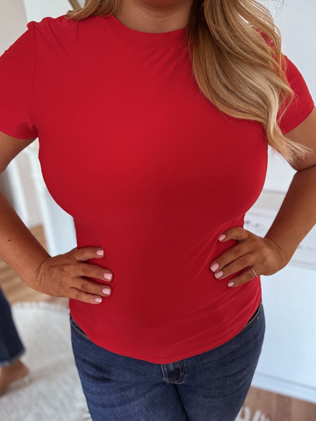 Obtiahnuté tričko s krátkym rukávom, vyrobené z elastického materiálu, ktorý sa prispôsobí postave a príjemne sa nosí. Ideálny kúsok na každý deň – môžete ho kombinovať s džínsami, sukňou aj elegantnými nohavicami. Modelka meria 168 cm a má na sebe veľkosť XL.